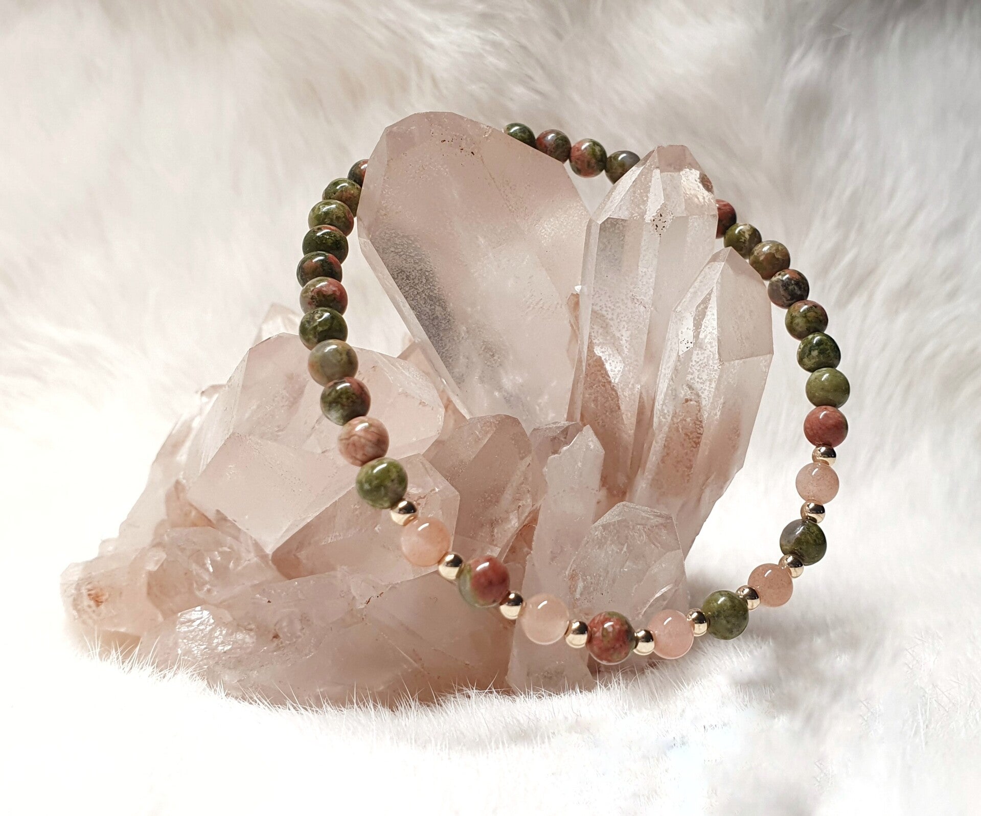 Unakiet met zonnesteen. Armbandje 4mm kraaltjes unakiet en zonnesteen van AA kwaliteit met 14kt gold filled kraaltjes geregen op zeer stevig juweliers elastiek.