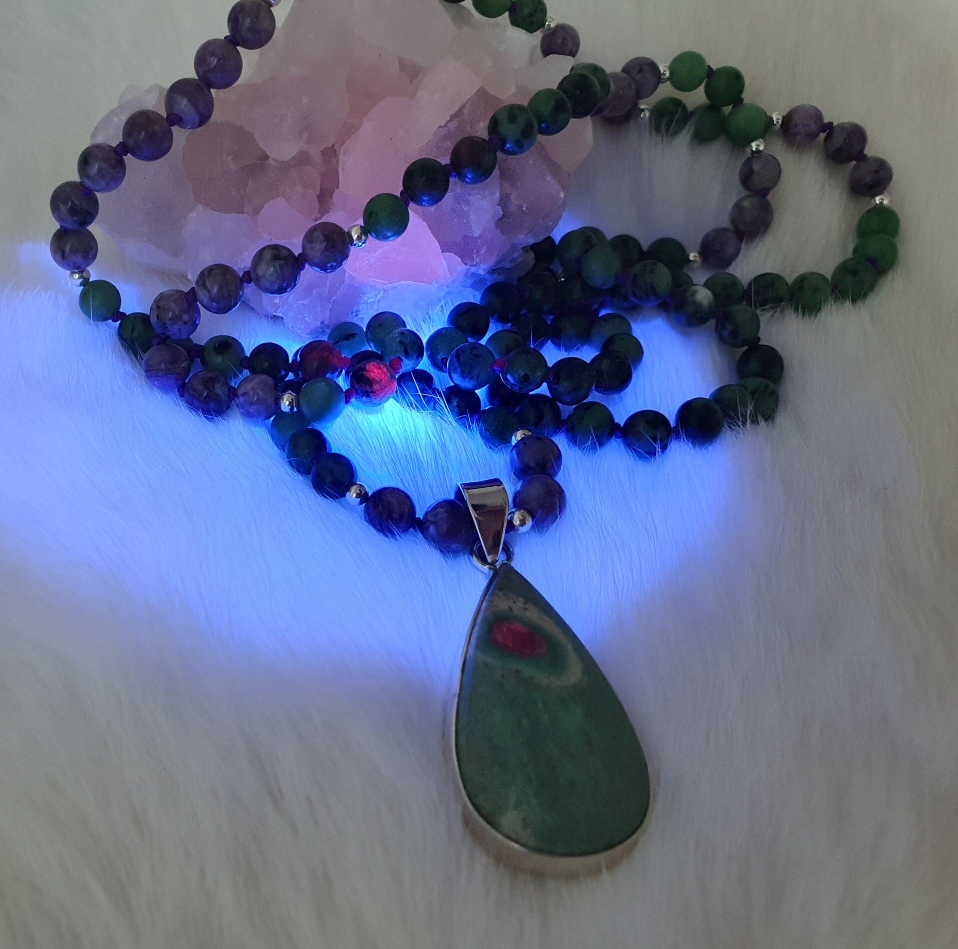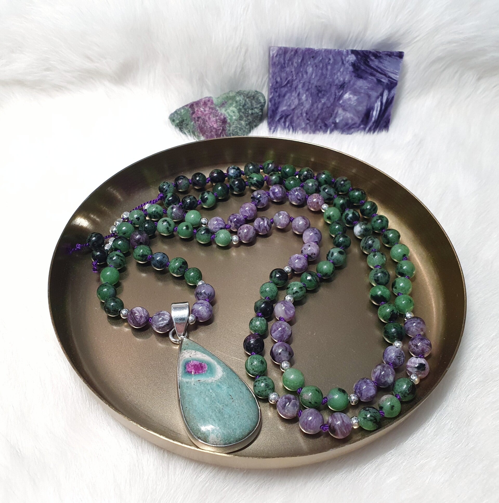 Mala charoiet, robijn in zoisiet met sz hanger robijn in fuchsiet. Deze exclusieve mala is een ware one of a kind en is met veel zorg en liefde samengesteld. Voor deze mala heb ik een kralen van A kwaliteit charoiet en robijn in zoisiet gebruikt en een prachtige sterling zilveren hanger van robijn in fuchsiet.