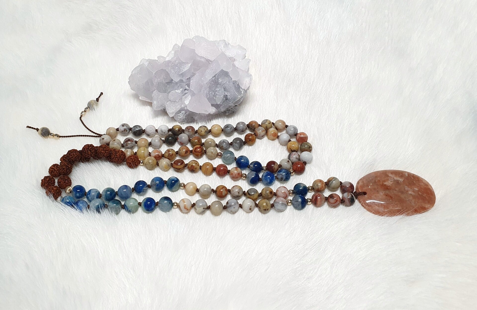 Mala hackmaniet, crazy lace agaat, rudraksha en perzikmaansteen