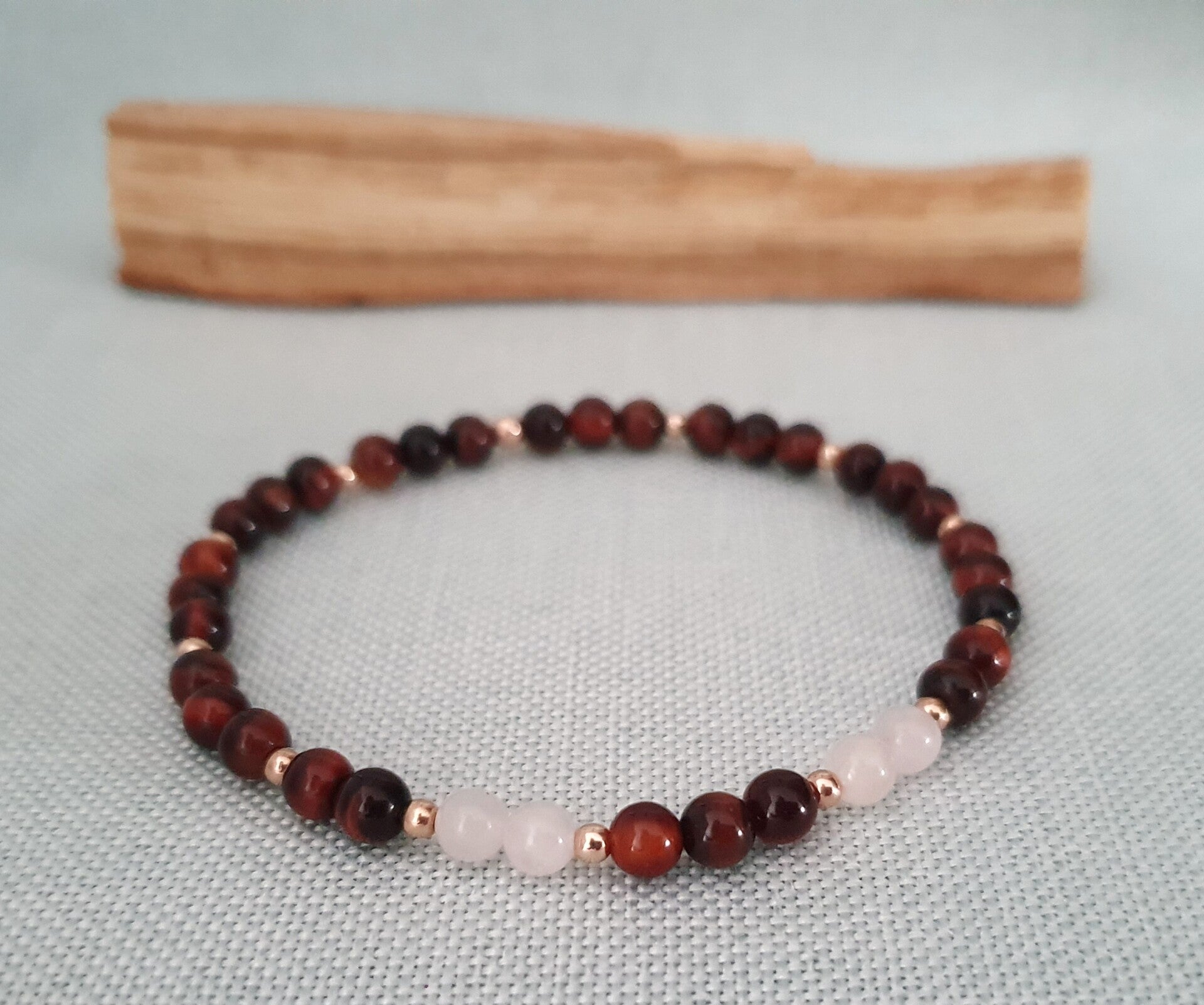 Rode tijgeroog met rozenkwarts. Armbandje met 4mm rode tijgeroog en rozenkwarts met roze 14krt gold filled details geregen op zeer stevig juwelierselastiek.