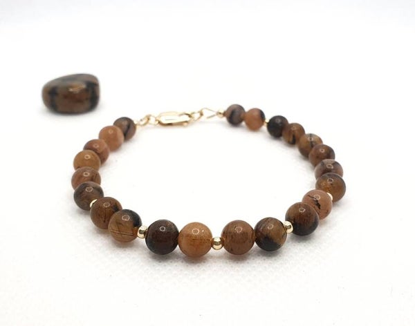 Chiastoliet of kruissteen. Armbandje met 6mm chiastoliet kralen gecombineerd met 14krt gold filled kraaltjes en slotje.
