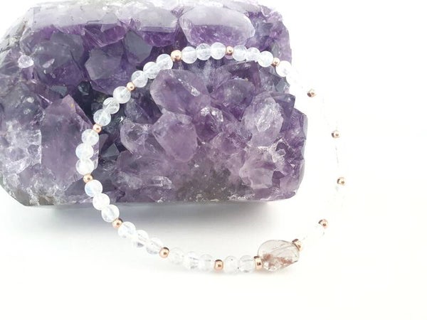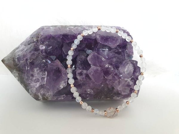 Lodoliet met regenboog maansteen en 14krt roze gold filled details. Armbandje lodoliet of garden quartz met AA kwaliteit 4mm regenboog maansteen en 14krt roze gold filled details geregen op zeer stevig juweliers elastiek. De regenboog maansteen heeft een mooie blauwe flash die niet te vangen is op de foto.