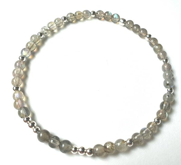 Armbandje met 4mm labradorietkraaltjes en sterling zilveren details geregen op zeer stevig juweliers elastiek