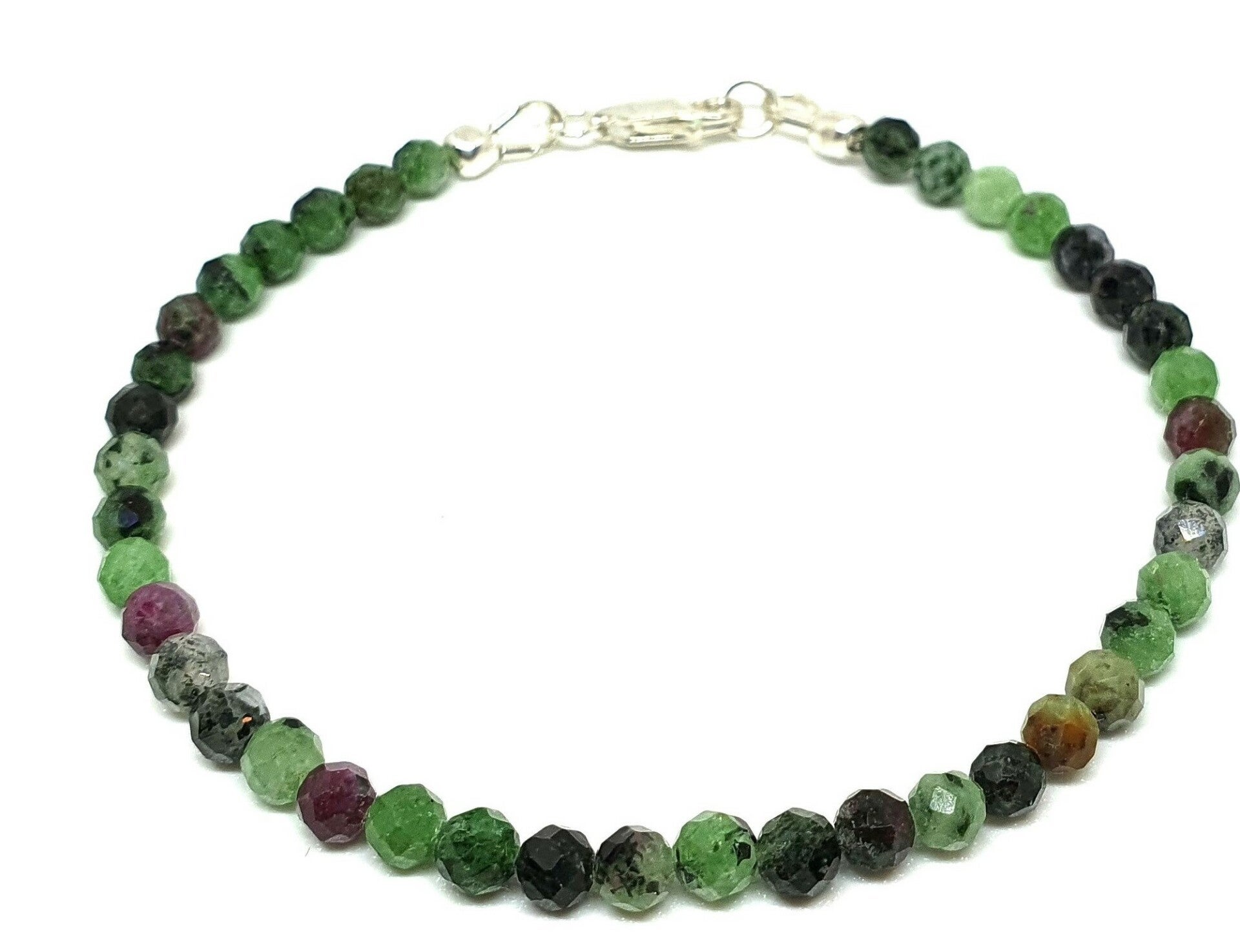 Robijn in zoisiet. Armbandje van robijn in ziosiet, 4mm kraaltjes. Het armbandje is gesloten met een sterling zilveren lobsterslotje.