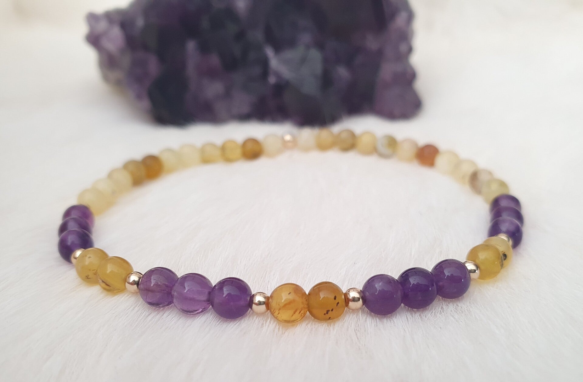 Opaal, geel of honingopaal met amethist en gold filled details. Armbandje 4mm gele opaal en amethist met 14krt gold filled details is geregen op zeer stevig juweliers elastiek.