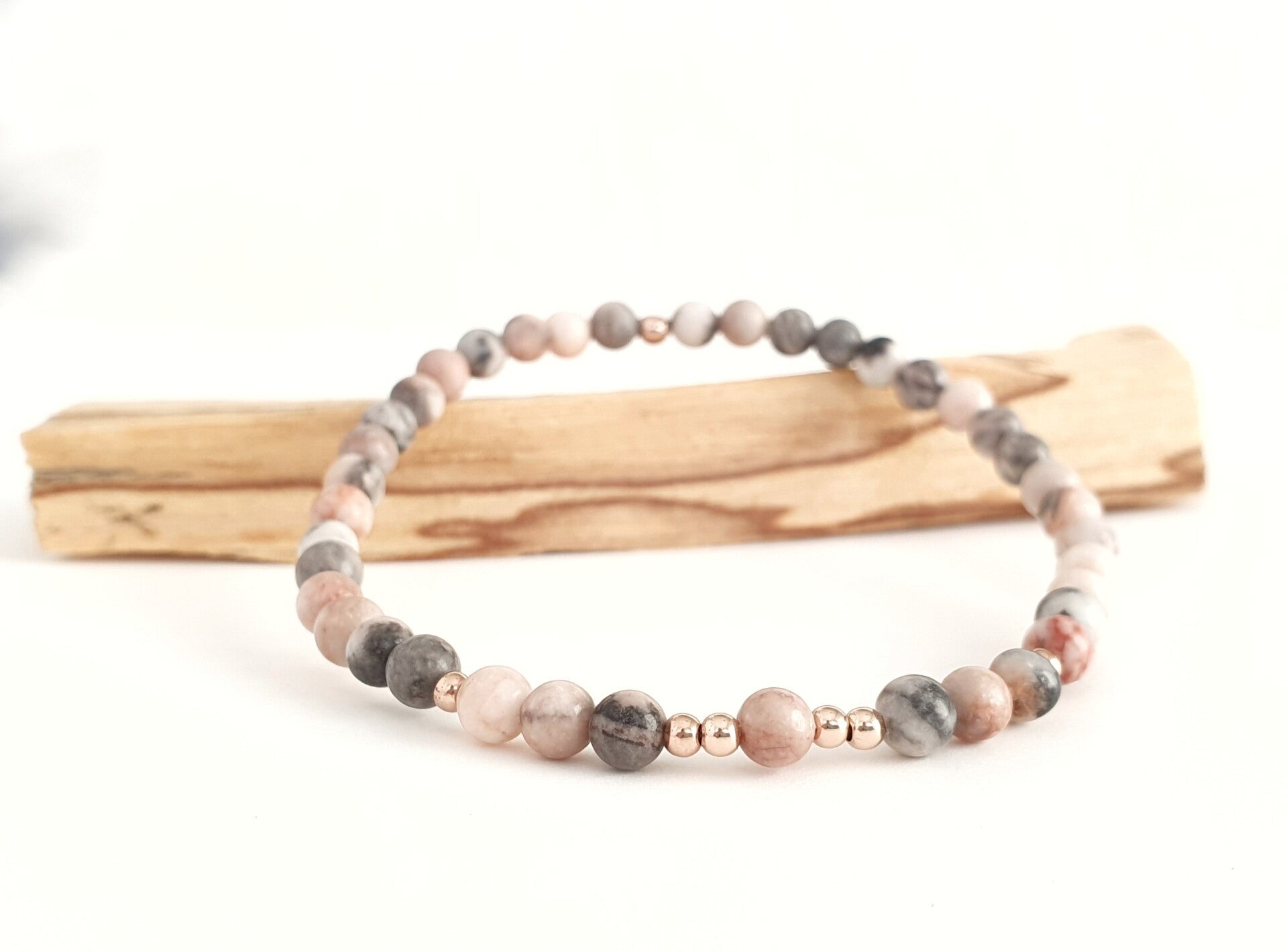 Roze zebra jaspis. Dit armbandje met 4mm roze zebra jaspis en roze gold filled details is geregen op zeer stevig juweliers elastiek.