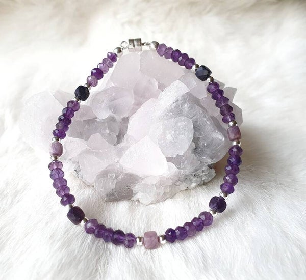 Sugiliet met amethist en sterling zilveren magneetslotje. Armbandje met kubus sugiliet en facetgeslepen amethist met sterling zilveren magneetslotje en kraaltjes.