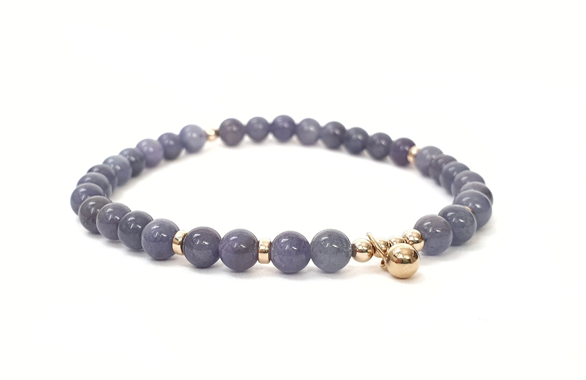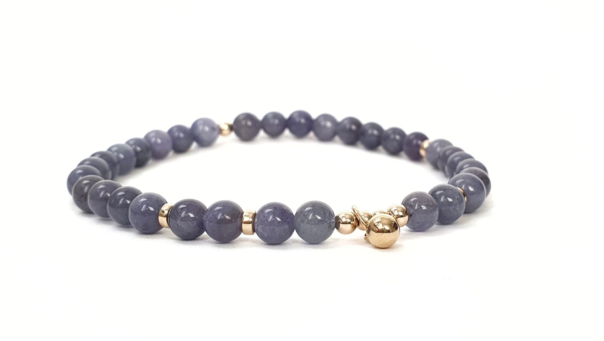 Tanzaniet met 14 krt gold filled bolletje. Armbandje met 5 mm tanzaniet van een prachtige kwaliteit gecombineerd met 14krt gold filled bolletje, geregen op zeer stevig juweliers elastiek.